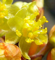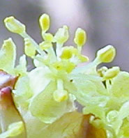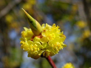 (クスノキ科シロモジ属) 葉がまだ出る前に黄色い小さな花の固まりをいくつもつけます。 雌雄異株で、私が見つけたのは雄株でした。雄花には9つの雄しべがついています。雄しべの先に2つ葯があるのが特徴です。 | ||||
