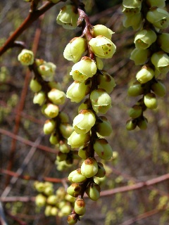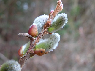 | キブシ (キブシ科キブシ属) 早春の山をドライブしていると 道脇からぶらぶらと葡萄の房のように 黄色の花がぶら下がっている光景に出会います。 それがこのキブシの花。 これも雌雄異株です。 雄花も雌花も雄しべと雌しべを持っていますが、 雄花は雄しべが大きく、雌花は雌しべが大きくなります。 これは雄しべがよく見えるので雄花のようです。 | ネコヤナギ |