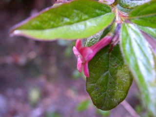 ミヤマウグイスカズラ (スイカズラ科スイカズラ属) ウグイスカズラとよく似ていますが、 こちらは毛深いのが特徴です。 山のスイカズラの仲間でいちばんに咲いています。 葉の陰に隠れて小さなかわいいピンクの花を咲かせます。 花の大きさは1.5〜2cmといったところ。 赤く熟した実はとっても甘いそうですよ。 |