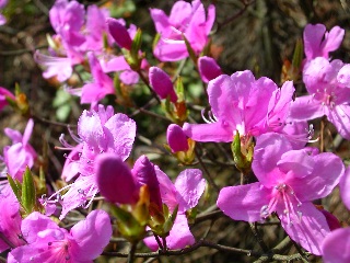 | 2003年4月6日撮影 (可児/御嵩/瑞浪の 山辺にて) 山の彩りも 一色ずつ増えて… 山肌に新芽の萌葱色、アブラチャンやコウヤミズキの黄色、タムシバの白色…に続いて山桜の薄紅色、ミツバツツジの紅紫色も加わりました。 |