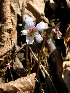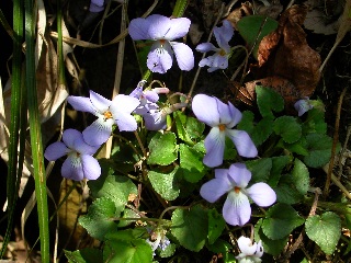 ナガバノスミレサイシン (スミレ科スミレ属) 山肌に点々と白いスミレが咲いていました。 葉っぱは出ていなくて、 花だけが地面から茎を伸ばして咲いているみたい。 花の後ろの飛び出た部分 (距という蜜を貯めるところ)が まあるい形をしているのが特徴です。 | タチツボスミレ |