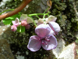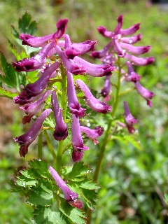 | アケビ | ムラサキケマン (ケシ科キケマン属) にんじんのように細かい葉、細長い花が特徴です。 赤紫の花をたくさん房のようにつけ、 やっと緑の増え始めるこの季節、 山の地肌に映えますね。 花の長い部分は距という蜜をためるところ。 こんな長くて奥の方にある蜜を どうやって吸うんでしょう? ある種類の虫は距に穴を開けて 大胆に蜜を吸うそうです。 |