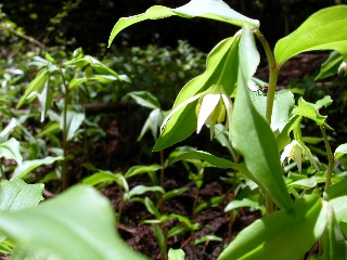 (ユリ科チゴユリ属) 毎年山菜採りの時期、山道の入り口付近の 日が差し込む場所に 足の踏み場に困るほど大群生してくれています。 鮮やかな緑の葉が、柔らかそうに波打ち その陰にこうべをたれたように花を咲かせる姿は まさに“稚児(ちご)”の名に ふさわしいかわいらしさです。 |