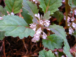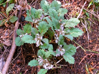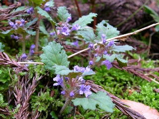 (シソ科キランソウ属) 山の斜面などで10cmくらいの草丈に 上品な紫色の花を咲かせています。 名にぴったりのシックな花。 キランソウとよく似ていますが、 キランソウがべたっと地面に這うように生えて 花を咲かせているのに対し ニシキゴロモは茎を上に伸ばして花をつけます。 一般には日本海側に多く見られると言われますが このあたりではしばしば見かけます。 花の上側が大きく2裂してV字のように見えるのも特徴です。 ときに白い花のものも見られます。 | ||