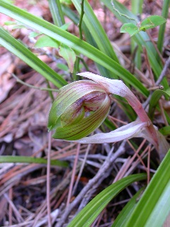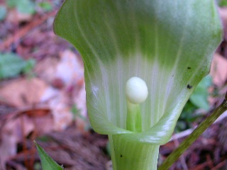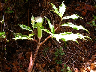 | スルガテンナンショウ (サトイモ科テンナンショウ属) 前回も登場したスルガテンナンショウですが、 葉っぱの形が分かりづらかったため、 再度ご登場いただきました(笑) 茎から出る葉が、1枚は大きく、1枚は極端に小さいのと 花のように見える部分(仏炎苞と言います)からちょこんと覗く棒の先(本当の花から伸びる付属体)が丸くぽってりするのが特徴ですが、これで分かるかな?? | ||||