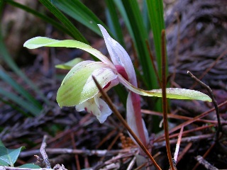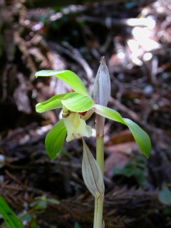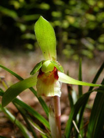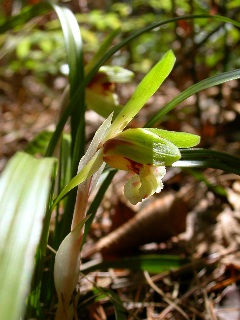 シュンラン (ラン科シュンラン属) 落葉樹の林で、落ち葉の中から 深緑の細長い葉を茂らせるシュンラン。 その葉の下で 淡い黄緑色の花を咲かせています。 あまりにひっそり咲いているので 花を見逃してしまいそうです。 | |