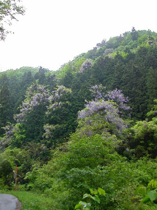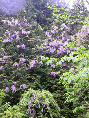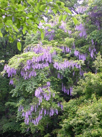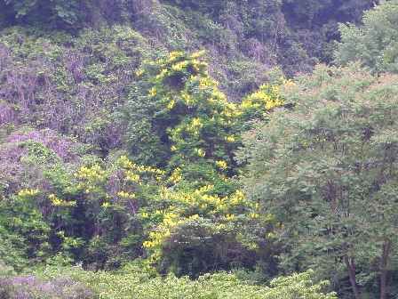 (マメ科ジャケツイバラ属) 山が藤色に染まる中、珍しい黄色の一群が…。 空に向かって逆さまに咲く黄色い藤、 といった風情です。 イバラなんてつくので一瞬とまどいますが れっきとしたマメ科の花です。 茎にはイバラのような棘があるんだそうです。 (間近になかなか見られないので 確認できないのが残念) 花はアップで見ると、マメというより 一見、胡蝶蘭のよう。 実の方はちゃんとマメらしい形です。 | ![]() |