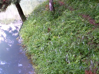 2003年6月1日撮影(御嵩・八百津にて) シライトソウの群生 先月様子を見に行った沼へ 時間を見つけて出かけました。 あのつぼみだったシライトソウが もう開いている頃… あのとき見つけたよりたくさんのシライトソウが 風に揺れて咲いていました。 白く繊細な花は、初夏の山によく似合います。 |