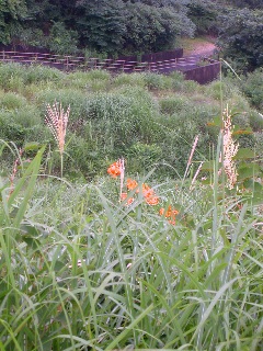 | 山の斜面にコオニユリのオレンジ。 |