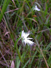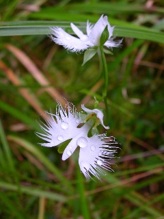 (ラン科ミズトンボ属) 観賞用によく栽培されているサギソウ。 野生のものは昔と違って なかなか会えなくなったとも聞きます。 湿地の中に 細長い、けれどしっかりした茎を20〜50cm伸ばし その先に3cmほどの白鷺が羽を広げたような 見事な白い花が咲きます。 花から伸びた距は3〜4cmになります。 風にそよいで本当に優雅な花… 湿地の清らかな水面に飛ぶ白鷺のようです。 | ![]() | |