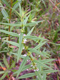 ヒメシロネ (シソ科シロネ属) 山野の湿地で見られるシソ科の植物。 30cm〜70cmくらいの草丈で 刀のような細長い葉っぱが 規則正しく互い違いに生えていて、目を引きます。 その葉の根元に咲く淡いピンク色の花は とても小さく、「姫」の名にぴったりです。 | サワシロギク