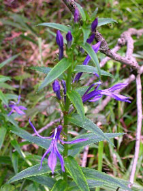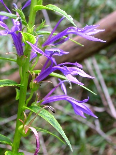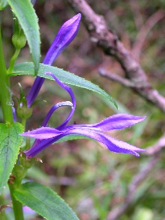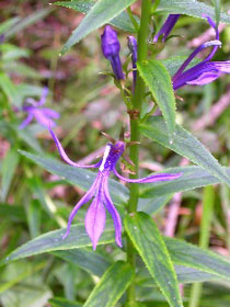 ![]() | サワギキョウ (キキョウ科ミゾカクシ属) サギソウに続いて会うことができました! 念願のサワギキョウ… まさかこの花にも会えるとは感激です。 昔はあちこちの湿地でサワギキョウが群生し いちめんを紫に染めた光景が見られたそうです。 木々に囲まれた湿地にひっそり咲いていた一群…。 ときには1mにもなる濃い緑の茎に、 段々に細長いつぼみをつけ、下から順に咲いていきます。 細い花弁が不思議な形ですが 凛とした高貴な雰囲気を漂わせています。 緑にマッチした深い紫色が何とも言えません…! 中央上に飛び出した部分にしべがあって 3裂した下の花びらにとまった虫の背中に 花粉がつく仕組みになっているそうです。 | |